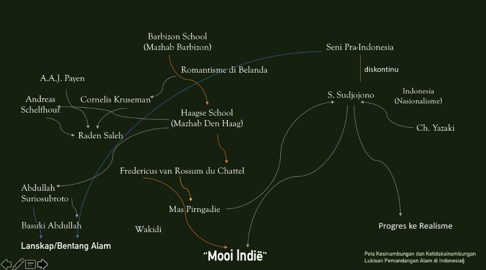 Sesi pertama dari Kelas Menulis Sejarah Seni 2026 yang dibawakan oleh DR. Aminudin TH Siregar—dipanggil Ucok oleh rekannya—menyegarkan kembali ingatan saya soal polemik tersebut. Mooi indie awalnya digunakan sebagai tengara genre lukisan, dengan subject matter bentang alam. Dicetuskan oleh Fredericus van Rosssum du Chattel, mooi indie punya kedekatan wacana dengan romantisme pada akhir abad ke-18; utamanya pada pilar wacana yang menuntut apresiasi terhadap alam sebagai respon Aufklarung dan konsekuensinya—revolusi industri. Dari Du Chattel, mooi indie kemudian menjadi markah era ketika membicarakan sejarah seni rupa Indonesia.